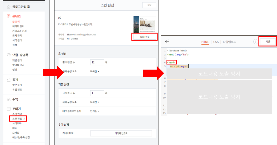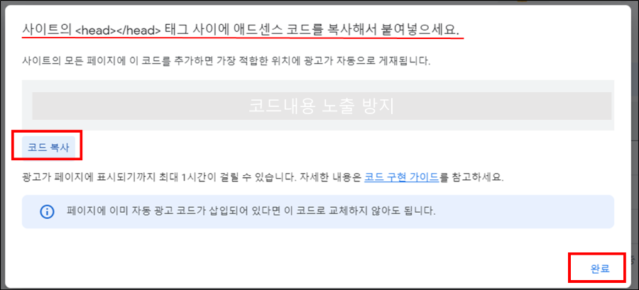 ์ฝ๋ ๋ ธ์ถ ๋ฐฉ์ง๋ฅผ ์ํด ํ์ ๋ฐ์ค๋ก ๊ฐ๋ ค๋์์ง๋ง, ์๋ ์ ๋ถ๋ถ์ "<script"๋ก ์์ํ๋ ์ ๋์ผ์ค ์ฝ๋๊ฐ ์์ต๋๋ค. ์ฝ๋ ๋ฐ์ค ๋ฐ๋ก ์๋ <์ฝ๋๋ณต์ฌ>๋ฅผ ๋๋ฅธ ํ <์๋ฃ> ๋ฒํผ์ ๋๋ฌ ๋ณต์ฌ๋ฅผ ์๋ฃํฉ๋๋ค. ๋ณต์ฌํ ์ฝ๋๋ ๊ด๊ณ ๋ฅผ ๊ฒ์ฌํ๊ณ ์ ํ๋ ํฐ์คํ ๋ฆฌ ๋ธ๋ก๊ทธ html์ ์ฝ์ ํด ์ค ๊ฒ๋๋ค.
