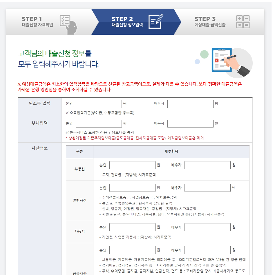 ๋์ถ์ ์ฒญ ์ ๋ณด ์ ๋ ฅ ๋จ๊ณ์์๋ ๋ณธ์ธ๊ณผ ๋ฐฐ์ฐ์์ ๋ํ ๋ณด๋ค ์์ธํ ์์ฐ, ๋ถ์ฑ ์ ๋ณด๋ค์ ์ ๋ ฅํด์ผ ํฉ๋๋ค. ์ ํผ๋ถ๋ถ๋ผ๋ฉด ์๋ก์ ์ฐ์๋๊ณผ ๋ถ์ฑ, ์์ฐ ์ ๋ณด ๋ฑ์ ๊ณต์ ํ์ฌ ์ต๋ํ ์ ํํ๊ฒ ์ ๋ ฅํ๋ ๊ฒ์ด ์ข์ต๋๋ค. ์ด์ ํจ๊ป ๋์ถ๊ธฐ๊ฐ๊ณผ ๊ฑฐ์น๊ธฐ๊ฐ, ์ํ๋ฐฉ๋ฒ ๋ฑ์ ์ ํํ๋ฉด ๋๋๋ฐ์.