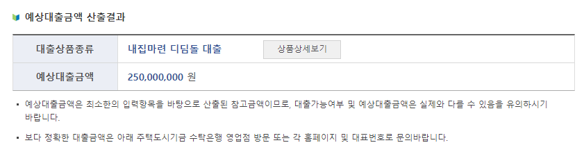 ์ด์ ๋จ๊ณ์์ ์ ๋ ฅํ ๋์ถ์ ์ฒญ ์ ๋ณด์ ๋ฐ๋ผ ์์๋์ถ๊ธ์ก์ด ์ฐ์ ๋ฉ๋๋ค. ์ ๊ฐ ์์๋ก ๋์ถ์ ์ฒญ์๋ฅผ ์์ฑํ์ฌ ๋ฐ์ ์์๋์ถ๊ธ์ก ์ฐ์ถ๊ฒฐ๊ณผ๋ ๋ค์๊ณผ ๊ฐ์ต๋๋ค. '๋๋ค๋ ๋์ถ' ์ํ์ ์ด์ฉํ ์ ์๊ณ , ์์ ๋์ถ๊ธ์ก์ 2์ต 5์ฒ์ ๋๋ค.