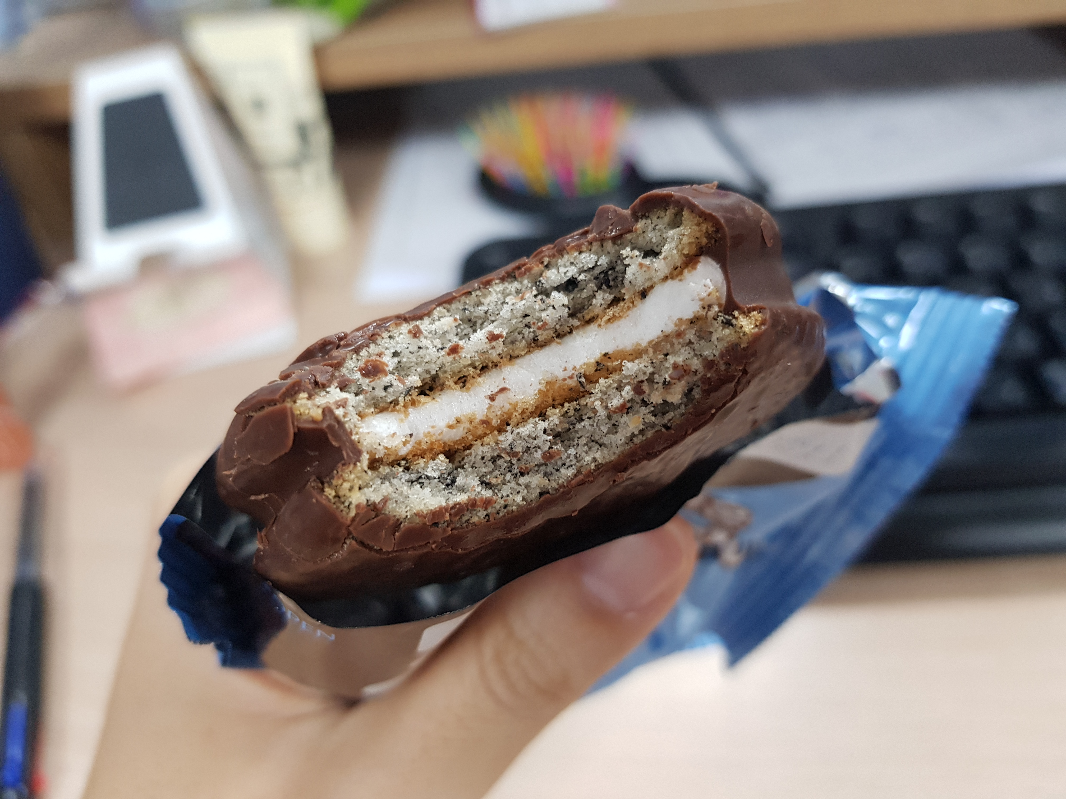 ํ์์ ์ด์ฝํ์ด์ ๊ฐ์ฅ ํฐ ํน์ง์ ๋นต์ ์์๋ค. ํ์์ ๊ฐ๋ฃจ๋ฅผ ๋ฃ์ ๋ฐ์ฃฝ์ผ๋ก ๋ง๋ค์ด ๋นต์ ํ์์๊ฐ ๊ฐ๋ํ๋ค. ์ด์ฝ ์ฝํ ์ ๊ฐ์ธ์ ธ ์์ ๋๋ ์ ๋๊ปด์ง์ง ์์๋ ํ์์์ ๊ณ ์ํ ํฅ์ด ํ ์ ๋ฒ ์ด ๋จน์ผ๋ ํ์ ์ฝ๋ก ๊ฐ๋ ๋๊ปด์ก๋ค.