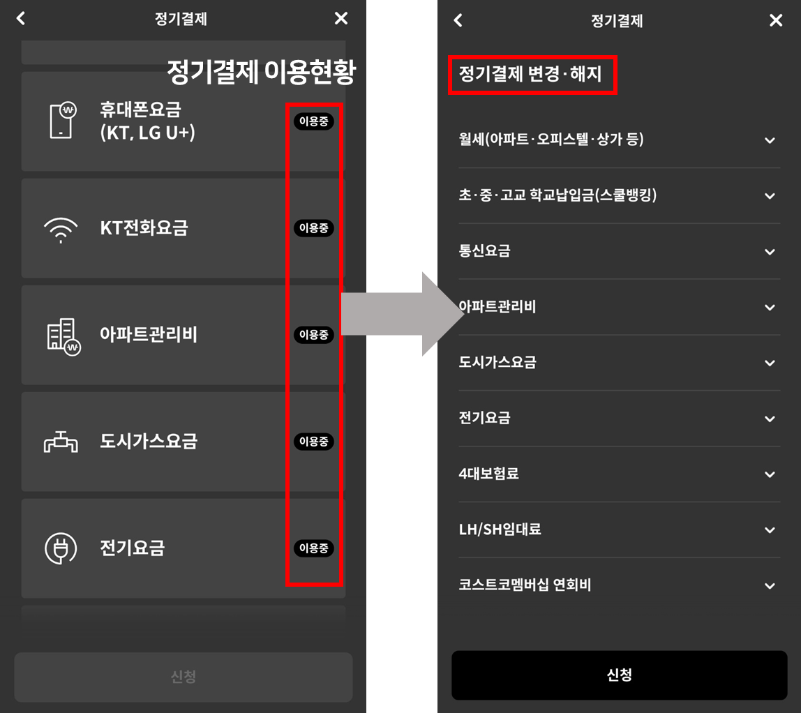โก ์ ๊ธฐ๊ฒฐ์ฐฝ ์ฐฝ์ ์คํฌ๋กค ๊ฐ์ฅ ๋ง์ง๋ง ๋ถ๋ถ์ "์ ๊ธฐ๊ฒฐ์ ๋ณ๊ฒฝ·ํด์ง" ์๋น์ค๊ฐ ์์ต๋๋ค. ์ ๋ ์ํํธ ๊ด๋ฆฌ๋น์, ์ ๊ธฐ์๊ธ, ํต์ ์๊ธ, ๋์๊ฐ์ค์๊ธ, ํต์ ๋น ๋ฑ์ ๋ฉ๋ถํ๊ณ ์์๋๋ฐ์. ์ ๋ถ ํด์งํ ์์ ์ ๋๋ค.