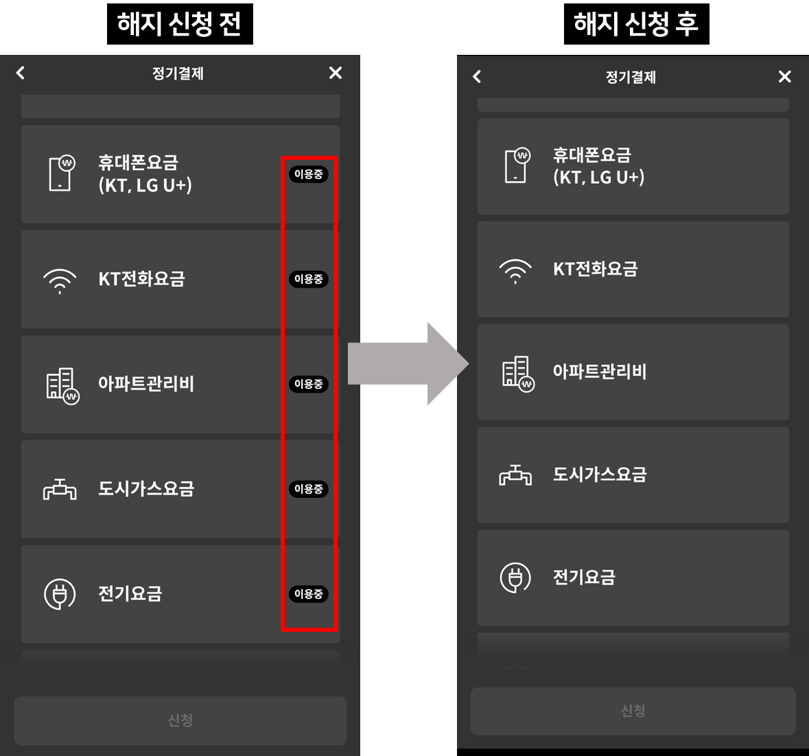 ์ ๊ธฐ๊ฒฐ์ ์ ์ฒญ๋์์ ์คํฌ๋กค์ ์๋๋ก ์ญ ๋ด๋ฆฌ๋ฉด ์ ๊ธฐ๊ฒฐ์ ํด์ง ๋ฐ ๋ณ๊ฒฝ์ด ์์ผ๋ฉฐ ์ฌ๊ธฐ์ ์ํ๋ ํญ๋ชฉ๋ค์ ํด์งํ ์ ์์ต๋๋ค. ์ํํธ ๊ด๋ฆฌ๋น๋ ๊ฐ์ค์๊ธ ๋ฑ์ ๊ฐ๋จํ ํด์ง๋ ์๋ด๋ฉ์์ง๋ฅผ ํตํด ์๋ด์์๊ฒ ์ง์ ํด์ง ์์ฒญ์ ํ ์ ์์ผ๋ฉฐ ํต์ ๋น๋ ๋ณธ์ธ์ด ์ฌ์ฉ ์ค์ธ ํต์ ์ฌ์ ์ ๊ธฐ๊ฒฐ์ ๋ฅผ ๋ณ๊ฒฝํ์ ์ผ ํฉ๋๋ค.