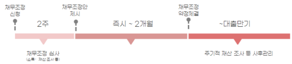 ์ฑ๋ฌด์กฐ์ ์ ์ฒญ ์ ์ฝ 2์ฃผ์ผ ๋ด์ ์ฑ๋ฌด์กฐ์ ์์ด ๋ง๋ จ๋๊ณ ์ฑ๊ถ๋งค์ ๋ฑ์ ๊ฑฐ์ณ 2๊ฐ์ ๋ด ์ฑ๋ฌด์กฐ์ ์ฝ์ ์ด ์ฒด๊ฒฐ๋ฉ๋๋ค. ์ดํ์๋ ์ฐจ์ฃผ๊ฐ ์ค์ค๋ก ์ ํํ ๊ฑฐ์น๊ธฐ๊ฐ ๋ฐ ์ํ์ผ์ ์ ๋ง์ถฐ ์ํ์ ํ๋ฉด ๋ฉ๋๋ค.