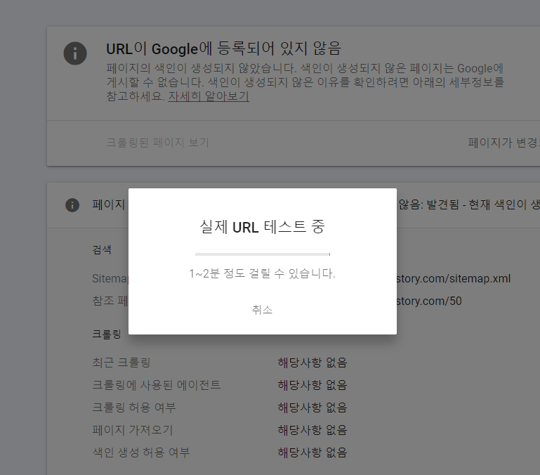 URL ํ ์คํธ๋ฅผ ์์ฒญํ๋ฉด ์๋ ์ผ์ชฝ ์บก์ณ์ ๊ฐ์ด ๋ชจ๋ ํ๋ฉด์ด ๋นํ์ฑํ ๋๊ณ 1~2๋ถ๊ฐ URL ํ ์คํธ๊ฐ ์งํ๋ฉ๋๋ค. ํน๋ณํ ๋ฌธ์ ๊ฐ ์๋ค๋ฉด ์ค๋ฅธ์ชฝ ์บก์ณ์ ๊ฐ์ด "URL์ ๊ตฌ๊ธ์ ๋ฑ๋กํ ์ ์์" ์ํ๋ก ๋ฐ๋๋๋ค.