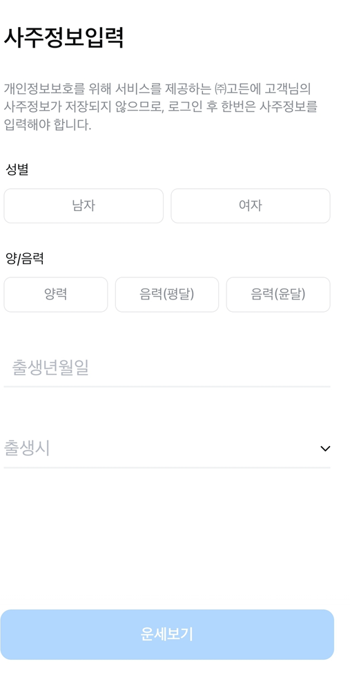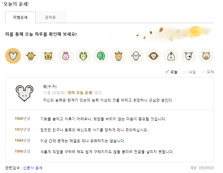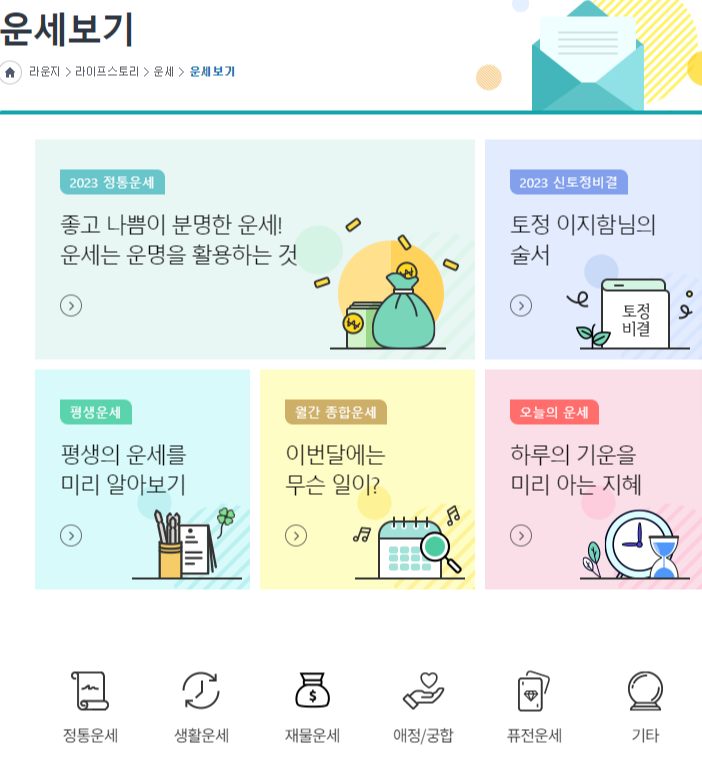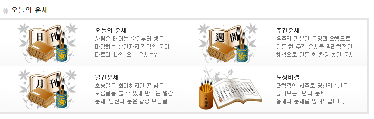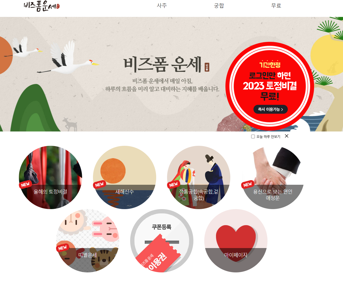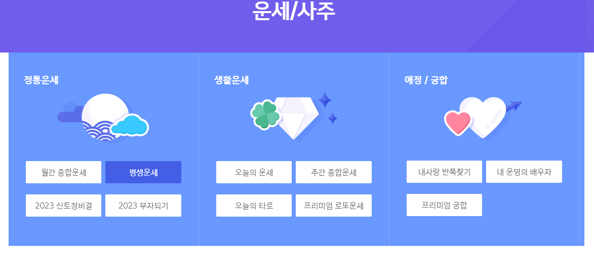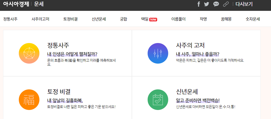 ์ธ๋ก ์ฌ ์ฌ์ดํธ์ธ ์์์๊ฒฝ์ ์์ ์ ๊ณตํ๋ ์ฌ์ฃผ/์ด์ธ ์๋น์ค์ ๋๋ค. ๋์ ์ฌ์ฃผ๋ฅผ ์ฌ์ธต ๋ถ์ ๋ฐ ํ์ด ํด์ฃผ๋ ์ ํต์ฌ์ฃผ๋ถํฐ ํ ์ ๋น๊ฒฐ, ๊ถํฉ, ๊ฒฐํผ์ด๋ ์ด์ฌ ์๊ธฐ ๋ฑ์ ์ ํ๋ ํ์ผ๊น์ง ๊น์ด ์๊ณ ํญ๋์ ์๋น์ค๋ฅผ ์ ๊ณตํ๋ ๊ฒ ํน์ง์ ๋๋ค.