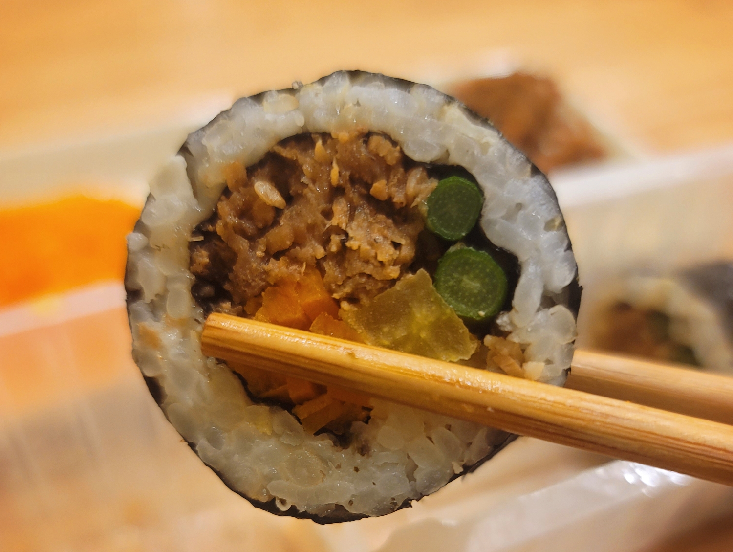 ๋ค๋ฅธ ๋ ์ฐ์ ๊ณค์ฝ ํ๋ฏธ ๊น๋ฐฅ ๋ถ๊ณ ๊ธฐ ๋ฒ์ ์ ๋๋ค. ํ๋ฏธ๊ณ๋ ๊น๋ฐฅ๊ณผ ๋ฌ๋ฆฌ ๊ณค์ฝ์์ด ์ฌ์ฉ๋๊ณ ์. ๋ถ๊ณ ๊ธฐ์ ๋ง๋์ข , ๋จ๋ฌด์ง, ๋น๊ทผ์ด ๋ค์ด๊ฐ์ต๋๋ค. ๊ตญ์ฐ ๋ผ์ง๋ถ๊ณ ๊ธฐ๊ฐ ํธ์งํ๊ฒ ๋ค์ด๊ฐ ์์ด์ ๋จน๋ ๋ด๋ด ๊ฐํํ๋ ๊น๋ฐฅ์ด์์. ์์ค์ ํ๋ ๊น๋ฐฅ๋ณด๋ค๋ ํจ์ฌ ๋ง์์์ต๋๋ค.