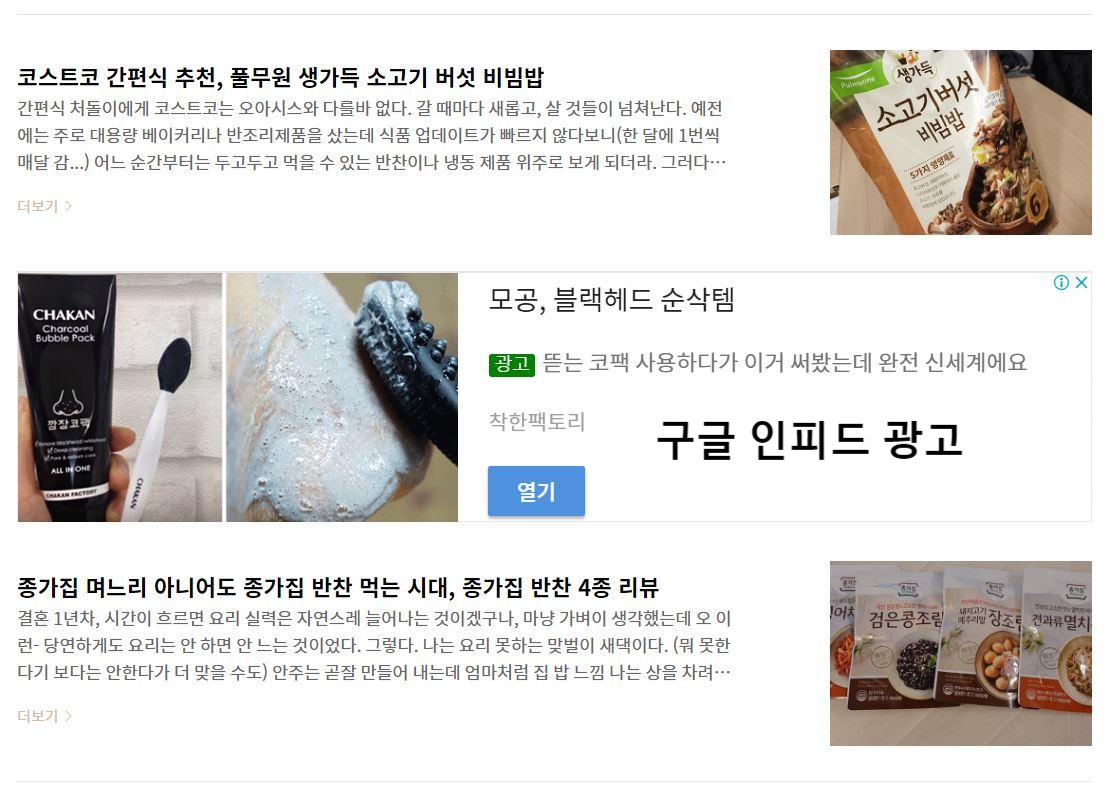 ๋๋ ์ธ๊ฐ์ง ํํ์ ๊ตฌ๊ธ ๊ด๊ณ ๋ฅผ ์ฌ์๋ค. ํผ๋ ํํ๋ก ๋ ธ์ถ๋๋ ๋ด ๋ธ๋ก๊ทธ์ ๊ฐ๋ฅํ 1)์ธํผ๋ ๊ด๊ณ , ์ฝํ ์ธ ๋ด์ ์ฝ์ ํ ์ ์๋ 2) ๋์คํ๋ ์ด ๊ด๊ณ ์ 3) ์ฝํ ์ธ ๋ด ์๋์ฝ์ ๊ด๊ณ ๋ค.
