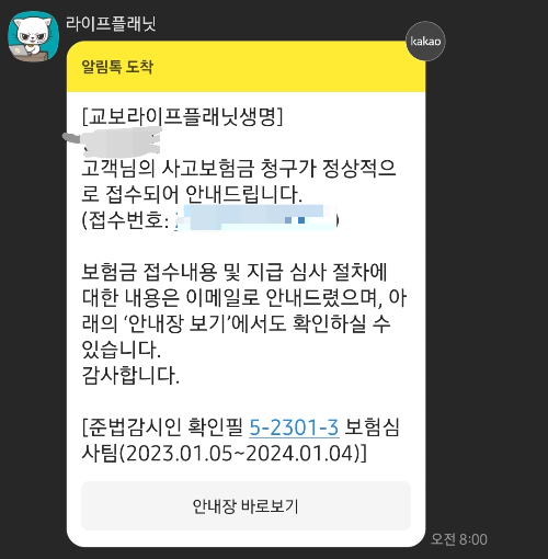 ์ ๋ ์ ๋ , ์ฑ์ ํตํด ๋ณดํ๊ธ ์ฒญ๊ตฌ๋ฅผ ์ ์ํ๋๋ฐ์. ๋ค์๋ ์์นจ์ ๋ฐ๋ก ์ ์์ ์ผ๋ก ์ ์๊ฐ ๋์๋ค๋ ์๋ฆผํก์ด ์ต๋๋ค. ๊ทธ๋ฆฌ๊ณ ๋๋๊ฒ๋ ๊ทธ๋ ์คํ ์ ์ฌ ์ฏค ๋ณดํ๊ธ ์ง๊ธ ์๋ด๋ฅผ ๋ฐ์ต๋๋ค.