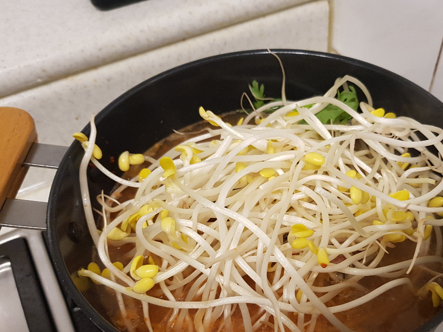 ๊ตญ๋ฌผ์ด ๋๊ธฐ ์์ํ๋ฉด ์ฝฉ๋๋ฌผ์ ๋ฃ๊ณ ๋๊ป์ ๋ซ์ง ์์ ์ฑ 5๋ถ ๋ ๋์ธ๋ค.