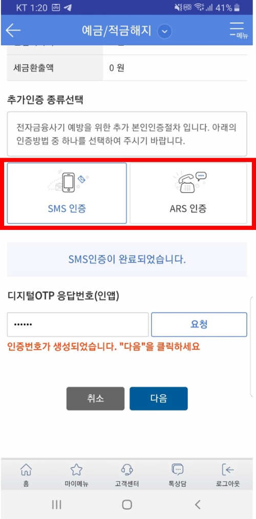 μμ κΈ ν΄μ§μ μλ£λ¨κ³μ λλ€. [ν΄μ§] λ²νΌμ λλ₯΄λ©΄ λ€μκ³Ό κ°μ μΈμ¦κ³Όμ μ κ±°μ³ λ§μΉ¨λ΄ ν΄μ§λλλ°μ. μ λ SMS μΈμ¦μΌλ‘ μΈμ¦λ²νΈλ₯Ό μ λ ₯ν ν 1μ°¨ μΈμ¦μ μλ£νκ³ μ. λ°λ‘ μλ μ κ° κ³Όκ±°μ μ€μ ν΄λμλ μνμν OTPλ²νΈ(6μ리)λ₯Ό μ λ ₯ν ν [μμ²]μ λλ¦ λλ€.